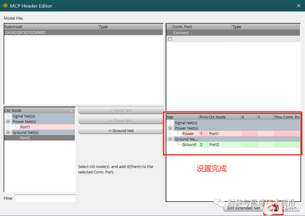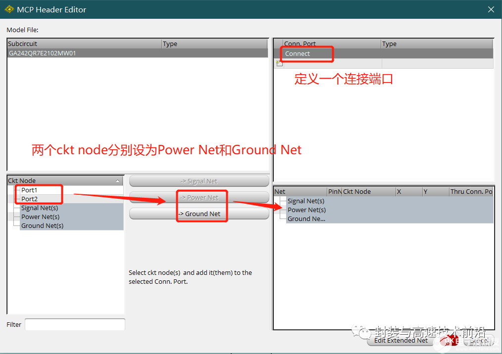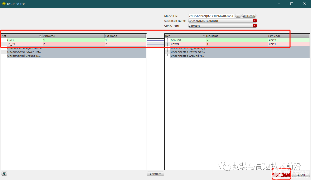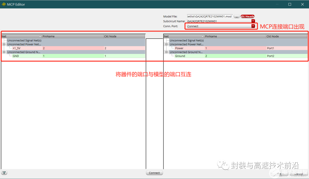 添加一个MCP的连接端口,分别将模型中的Port1和2设置为电源与地。设置完成后,点击OK,回到MCP Editor界面,MCP的连接端口出现,此时将器件的端口与模型刚设置的连接端口互连,这样就完成了基于MCP的SPICE模型的定义。