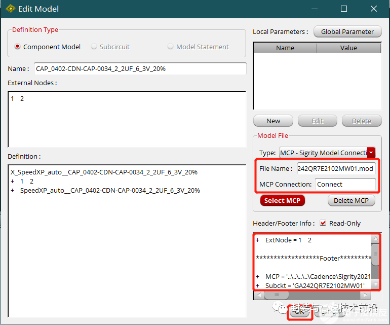 点击OK后,回到Model编辑界面,可以看到.mod的SPICE模型已经通过MCP的连接端口连到电容上了,点击OK即可。