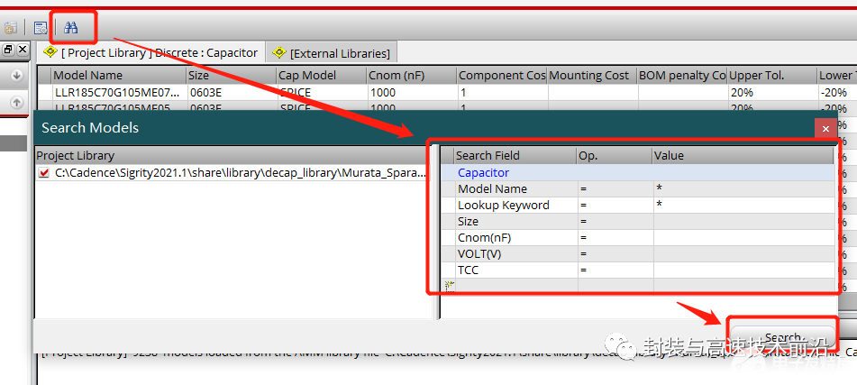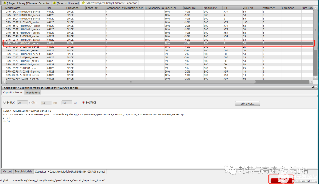 可以使用查找功能,根据容值、封装SIZE等在该库中找到想要的电容,点击Search后,所有满足条件的电容会列出来,选择其中一个电容,点击Select,跳转到Model Assignment界面,显示该类所有电容已经附上这个模型了,status一列显示为绿色Validated字样,表示模型附成功了,点击OK即可。.ckt、.mod、.s2p等各种格式的电容模型均可以通过该方式实现导入与使用。
