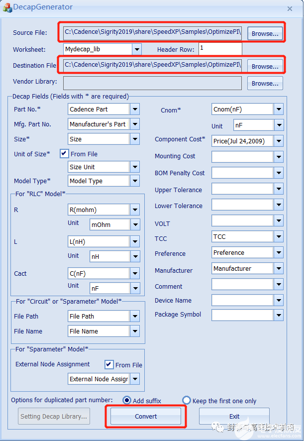2) 打开后在Source File一栏导入库头文件的.xls模板表格(默认模板表的路径在Cadence – Sigrity xxxx – share– SpeedXP – Samples – OptimizePI – Decap_Generator)
