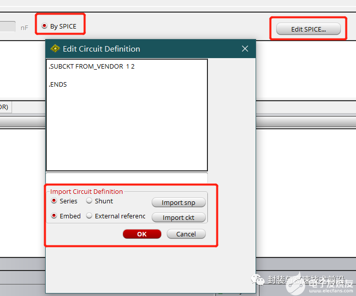 可以使能By RLC,参数化设置RLC三个寄生参数值,定义一个一阶RLC模型;也可以使能By SPICE,选择Edit SPICE按钮,打开电路定义编辑界面,在这里可以直接导入S参数模型或多种格式的SPICE模型。