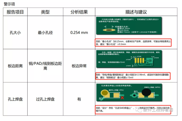 比如下面的3个警示项目,对最小孔径、板边距离和孔上焊盘进行了预警,这三个设计虽然不会有什么电气风险,但是随着产品数量的增加,难免有一定概率会失效,这就是需要改动的地方。