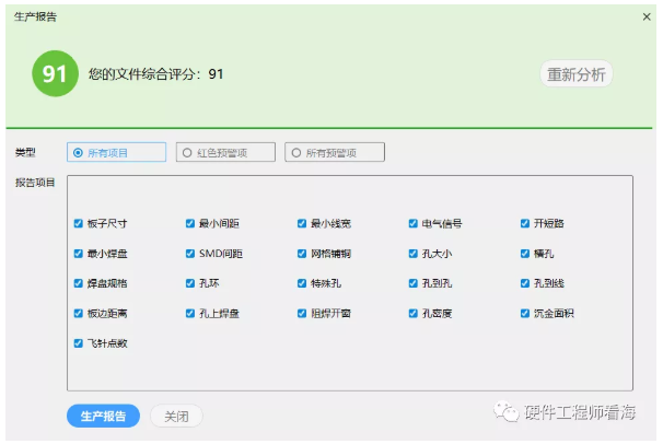 华秋DFM在分析之后会给出文件的综合评分,输出《生产报告》后会对PCB设计文件各个设计风险进行详细评估