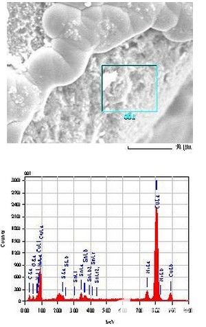 我司一客户在化学镍金的生产过程中,发现有少量孔内沉不上镍金,经过我司工程师现场跟进处理,改善前处理等均无效果,金相显微镜切片分析为点状露铜,根本找不出问题的根本原因。经我司研发中心电子扫描显微镜与能谱(SEM&EDS)分析如下