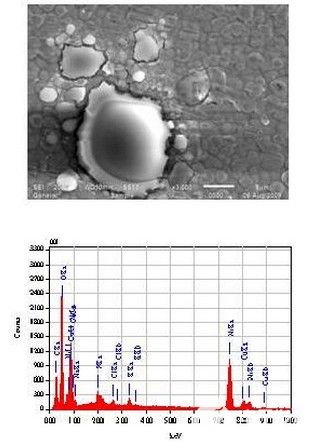 从图片上来看,有点状的凸起处明显分层,应该是孔壁有粘附物导致孔铜与孔壁分离,从分布来看,该污染物有点状的也有面状的。故从该切片图片来看,只能判定是该板在钻孔或是在PTH中受到外来污染,但究竟为何物有如此大的能耐?在我司研发中心电子扫描显微镜与能谱(SEM&EDS)分析下原形毕露。