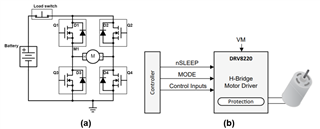 图2:(a)使用外部截断开关、具有低功耗睡眠功能的H桥的简单实现;(b)有自动睡眠模式的TI DRV8210