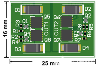 图4:H桥和基础周围电路的离散实现;PCB面积为16mm x 25mm或400mm2