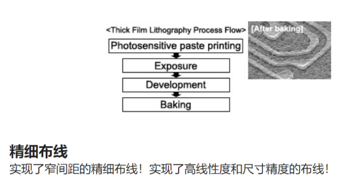 关系,前面提到的Thick Film Lithography就是近年来开发的创新工艺技术之一,也是其专门为多层陶瓷器件高精度金属化电路制造研发的专用技术。从技术路径上Thick Film Lithography Process改进了原有的直接印刷工艺,使精度一致性等得到巨大提升。