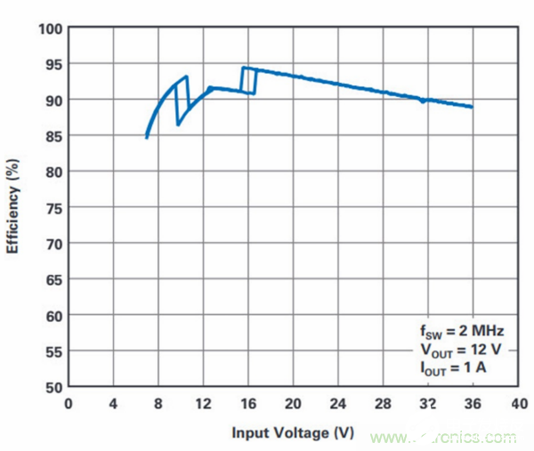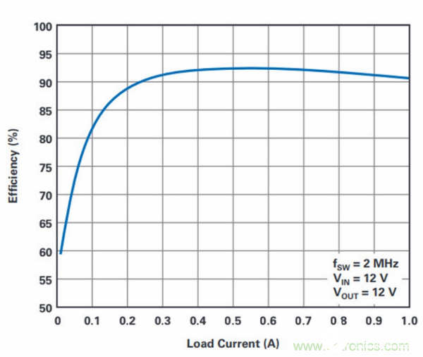 图4中的效率曲线表明,即使工作开关频率为2 MHz时,LT394212 V稳压器也具有接近95%的出色峰值效率,而在其大多数输入电压范围内的效率为85%或更高。即使以其总输出功率的十分 之一为其输出供电,也可保持80%以上的效率,这表明该器件在轻负载条件下仍可高效运行。
