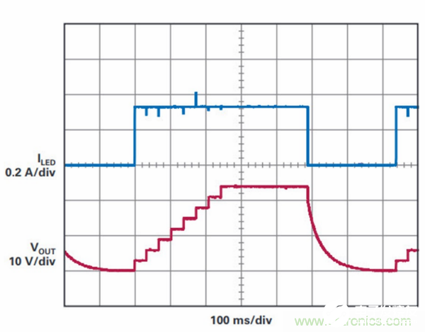 图5. 在顺序点亮转向信号应用中,每次点亮一个LED,从而迫使DC-DC转换器迅速适应新的 PVIN:PVOUT 组合。这对LT3942来说不是问题,因为它可在 顺序点亮转向模式期间从升压、降压-升压、降压工作模式无缝转换,从而确保在各种模式下维持稳定的LED电流。