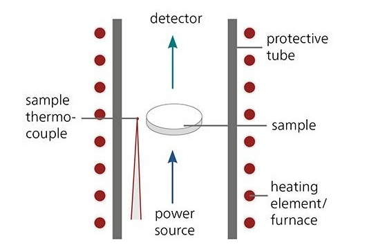 在上图中,显示了用于执行LFA的设备的示例。图中的示例代表了板材。该测试通常在封闭的机器中进行,并通过软件分析结果。关注的参数是热扩散率,可以使用以下公式确定: