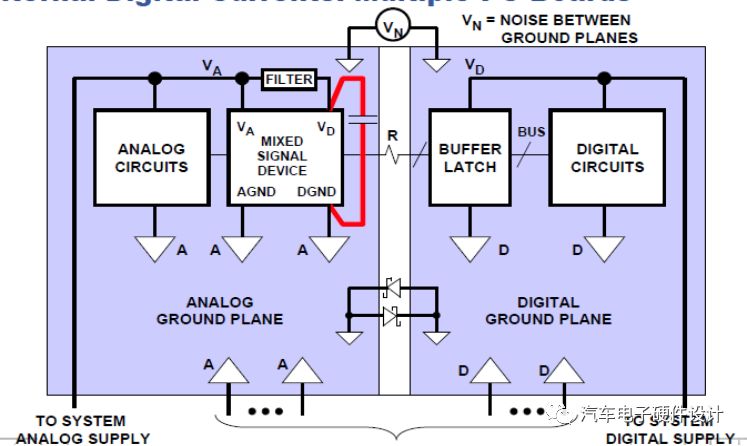 混合信号IC(较低的数字电流)的的接地:多板设计
