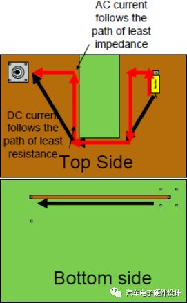 在DC,电流顺着最小电阻路径返回,随着频率的升高,电流顺着最小电感路径返回