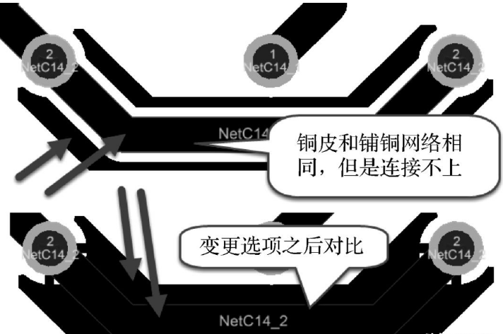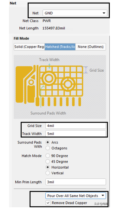 图2 Solid铺铜和Hatched铺铜的对比② Track Width:铺铜线宽。Grid Size:铺铜线宽之间的间距。如果需要实心铺铜,那么线宽值比栅格值大就好,推荐线宽值5mil,栅格值4mil,这个值不宜设置过大或者过小。 设置过大,一些较小Pitch间距的BGA没办法铺铜进去,造成铜皮的断裂,影响平面完整性。设置过小,铺铜更容易进入一些电阻、电容的缝隙中,造成狭长铜皮的出现,增加生产上的难度或者产生串扰。③ Pour Over All Same Net Objects:选择此选项,对于相同的网络都需要采取铺铜,不然会出现相同网络的走线和铜皮无法连接的现象,如图3所示。④ Remove Dead Copper:移除死铜,勾选此选项可以对铺铜产生的孤立铜皮进行清除,如图4所示。