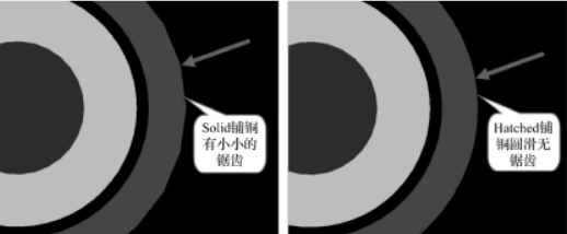(1)执行菜单命令“放置-铺铜”,进入铺铜设置窗口,为了更有效率地进行铺铜,按照图10-94所示进行推荐设置。① Hatched(Tracks/Arcs):动态铺铜方式,铺铜由线宽和间距组合而成,铺铜会相对圆滑,符合高速设计要求,图2所示为Solid铺铜和Hatched铺铜的对比。