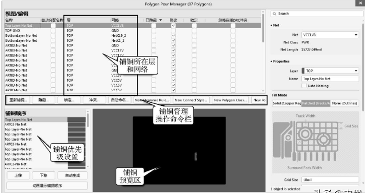 图7 铺铜管理器(1)视图/编辑:可以对铺铜所在层和网络进行更改。(2)铺铜管理操作命令栏:可以对铺铜的动作进行管理。(3)铺铜顺序:可以进行铺铜优先级设置。(4)铺铜预览区:可以大概看到铺铜之后或者选择的铺铜。多边形铺铜挖空的放置有时在铺铜之后还需要去删除一些碎铜或尖岬铜皮,多边形铺铜挖空的功能就是禁止铜铺进放置该区域,只针对铺铜有效,不
