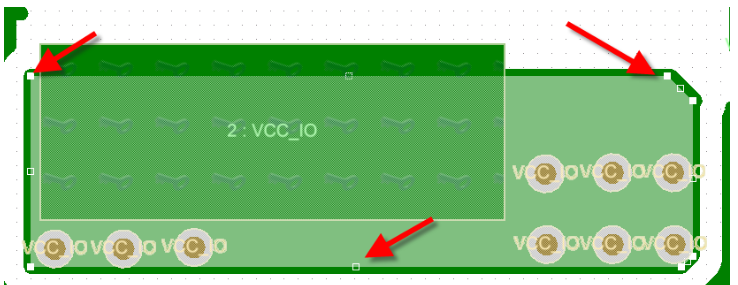 一些调整,如铺铜宽度的调整、钝角的修整等。(1)铺铜的直接编辑:单击选中需要编辑的铺铜,选中之后,即可看到此块铺铜的四周有一些白色“小点”,如图10 所示,将鼠标指针放在白色“小点”上拖动,可以对此块铺铜的形状及大小进行调整,调整完成之后,记得对此块铺铜进行铺铜刷新(在铺铜上单击鼠标右键,选择执行命令“铺铜操作-调整铺铜大小”)。