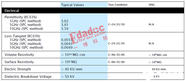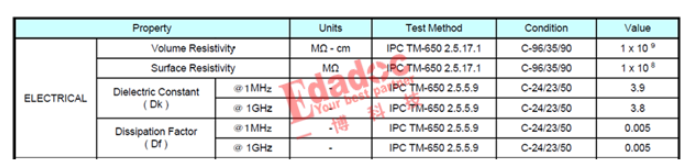 可以看到电气特性都有介电常数和损耗因子的参数,其他的还有如体电阻和表面电阻等,我们一般也关注比较少,这些只需要满足IPC的规格要求就可以了,一些特殊的产品可能会去关注这几个参数,在此不是我们关注的重点。