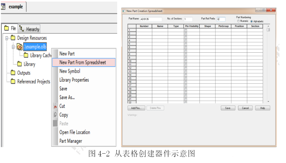 第一步,在olb文件单击鼠标右键,建立新的New Part From Spreadsheet,然后在弹出的界面中Name中输入AD9135,下面的No. of Sections选择填写1,有多个Part的时候填写Part的数目,Part起始字母为U,不用更改,如图4-2所示: