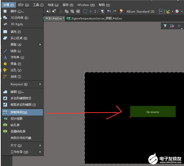 2.在新建的PCB上,点击 Place 》 Embedded Board Array/Panelize。如下图所示。