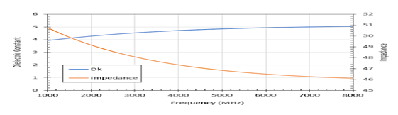 因为这些色散源始终存在于走线中,所以它们会导致实际PCB走线的阻抗,速度和所有其他信号完整性指标是频率的函数。下面显示了一个示例,该示例显示了Dk实部中的色散如何影响微带走线的阻抗。