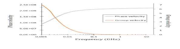 带铜粗糙度和介电色散的示例带状线上信号的群速度和相速度。