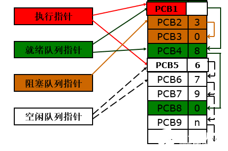 同一状态的PCB,依靠链接指针链接成队列。就绪队列;若干个阻塞队列;空白队列(PCB区的空PCB块)
