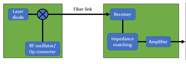 在接收端,光电二极管用于接收光信号,全光或GHz包络检波器用于提取编码的微波信号。这允许提取GHz模拟信号,该信号可以与各种幅度调制方案(例如,针对LTE,WiFi或其他RF协议的数字化QAM)一起使用。下面显示了光纤无线电传输中使用的体系结构的概述。