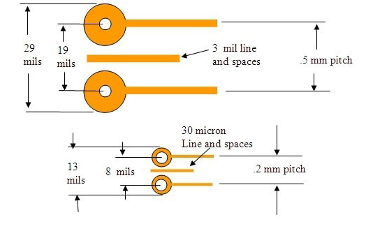 使用新的微电路设计技术代替常规的印刷电路技术可节省大量的空间。如今,典型的75微米线宽的最佳间距约为.5mm,通过75微米线和250微米(10mils)的焊盘可得到75微米(3mils)。垫片之间的间距为225微米(9mils),垫片之间仅允许一条75微米的线,对于大多数商店来说,这种最小规格是很难的。
