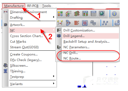 在allegro软件中,输出钻孔文件的时候,要特别注意,圆形钻孔的输出与槽孔的输出是不一致的,圆形的钻孔输出步骤是,菜单栏那里点击Manufacture-NC-NC Drill,执行这个来输出圆形钻孔,而槽孔的输出则不同,菜单栏那里点击Manufacture-NC-Route,执行这个来输出槽孔,如果PCB版图上没有槽孔,则不需要执行该操作,输出过程呢如图1-19所示。