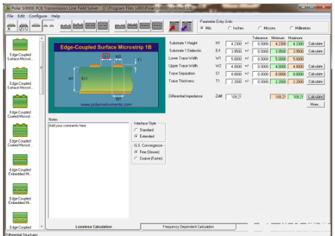 第二步,如图1-23所示,根据图15-1所示的层叠结构,计算出差分100欧姆表层所走线的线宽与线距。