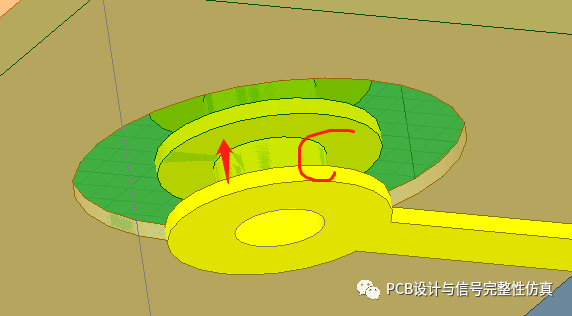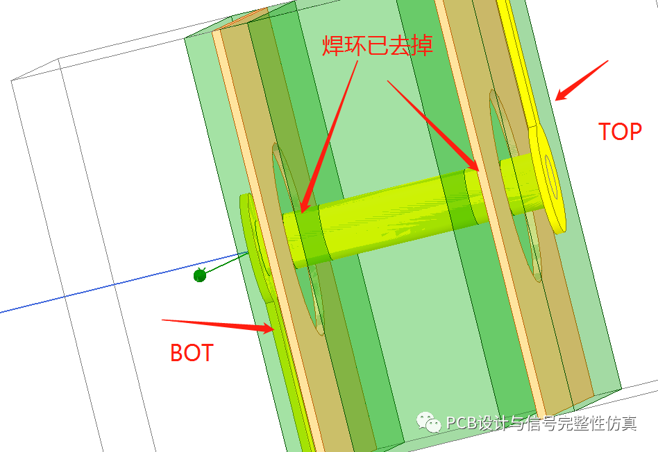 道理明白后,那么剩下的就简单了。由于焊环的存在,焊环是金属,焊环外的铜皮也是金属,中间隔着反焊盘间隙的介质(X轴和Y轴方向)。根据初中学的知识,两个金属之间存在介质就会产生电容,于是容性就增加了。而这只是一方面,另一方面焊环和焊环之间也会产生电容(Z轴方向),多重功效加在一起就把我们的过孔阻抗给拉低了。
