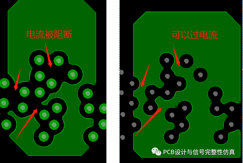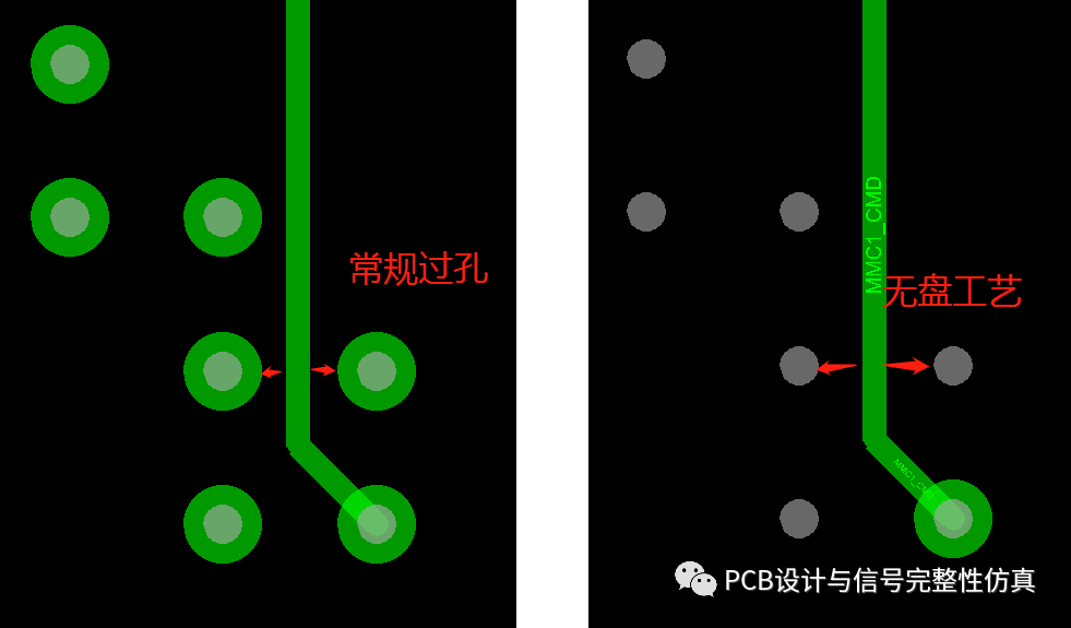 左边是我们没有采用无盘艺的情况下,两个过孔之间的走线,可以看见走线和过孔焊环非常靠近,有一定的风险。而右边则是采用了无盘工艺后的情况,此时走线距离孔的间距大大增加,风险降低。