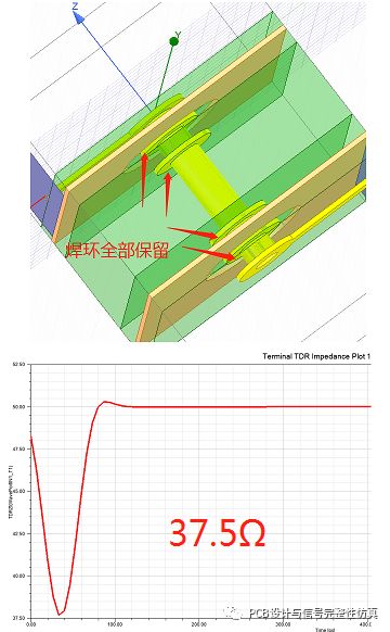 由于过孔的特性,通常过孔的阻抗都是小于我们传输线阻抗50Ω的,当传输线阻抗与过孔阻抗不匹配,就会产生反射,导致我们S参数中看到的损耗增加。