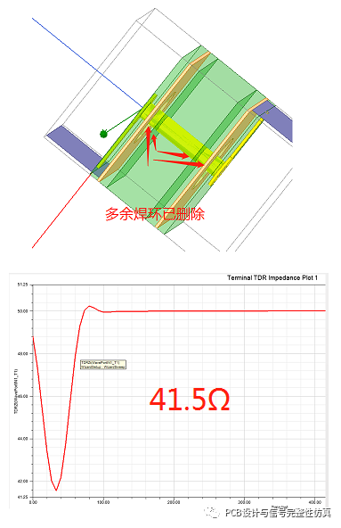 将两个结果进行对比,可以看到采用无盘工艺后过孔阻抗由37.5提升到了41.5,更接近传输线阻抗50Ω,因此会有更小的反射,更好的信号质量。