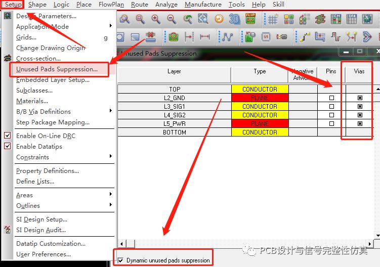 这里以一个六层板为例,假设我们的信号需要从顶层通过过孔传输到底层,那么必要的焊环就只有顶层和底层的焊环,中间的所有焊环都可以去掉。