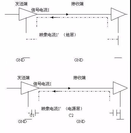 如果信号电流下方是电源层(POWER),此时的映象电流回路是通过电容耦合所达到的,见图2。