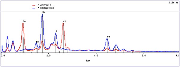 阻焊层(蓝色光谱)中包含硅(Si),用于控制液体阻焊剂在固化前的粘度。它还包含钡(Ba)和硫(S),二者结合成硫酸钡而用作阻燃剂。所有这些元素包含在阻焊层中都是预期的,如蓝色光谱所示。