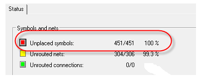 第一步,需要检查原理图的网表是否导入成功,执行菜单命令Display,在下拉菜单中选择Status,整个PCB文件的状态,如图324-1所示,进入到状态的界面,最上面一栏是Symbols and nets的选项,网表导入成功的情况下,这里是有数据的,没有导入成功的话,这里的数据全部是零。如图6-36所示,这个案例就表示了网表已经成功导入,一共有451个器件,现在这些器件全部在后台,并未放置到PCB中,我们要做的就是将这些器件放到PCB中,进行pcb设计;
