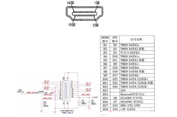 HDMI的全称是“ High Definition Multimedia”,即:高清多媒体接口。HDMI 在引脚上和 DVI 兼容,只是采用了不同的封装。与 DVI 相比。HDMI 可以传输数字音频信号,并增加了对 HDCP 的支持,同时提供了更好的 DDC 可选功能。HDMI 最远可传输 15 米,足以应付一个 1080p 的视频和一个 8 声道的音频信号。HDM1 支持 EDID 、DDC2B ,因此 HDMI 的设备具有“即插即用”的特点,信号源和显示设备之间会自动进行“协商”,自动选择最合适的视频倍频格式。一对时钟差分,三对数据传输差分。