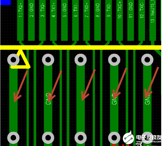 尽可能使用尺寸最小的信号线过孔和HDMI连接器焊盘,因为其对100 差动阻抗产生的影响较小。较大的过孔和焊盘可能会导致阻抗下降。推荐使用过孔8mil/16mil,或者8mil/18mil。