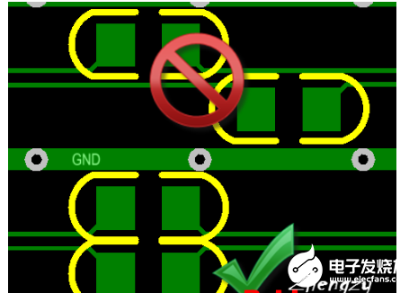 B、信号线迹碰到过孔、电阻器组件盘或 IC 引脚处;