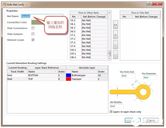2)在“New Net Name”栏可以点击更改某个网络的名字,比如“VCC”等,这个界面就类似于网络的几种管理器一样,如果不想更新,系统会自动生成一个流水号网络。