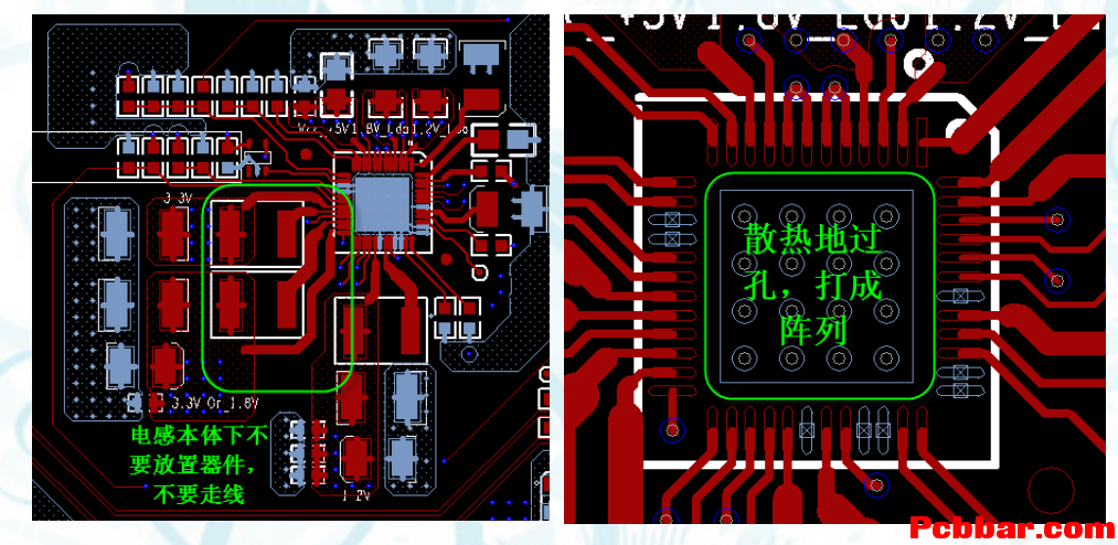 8)开关电源芯片和电感下面不要布其他信号线,开关电源芯片的散热焊盘要打散热地过孔,并开窗,保持充分的散热。
