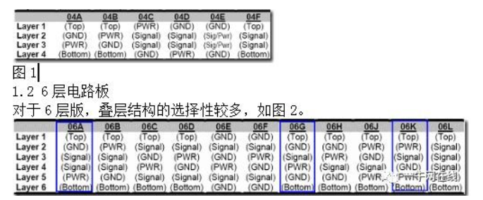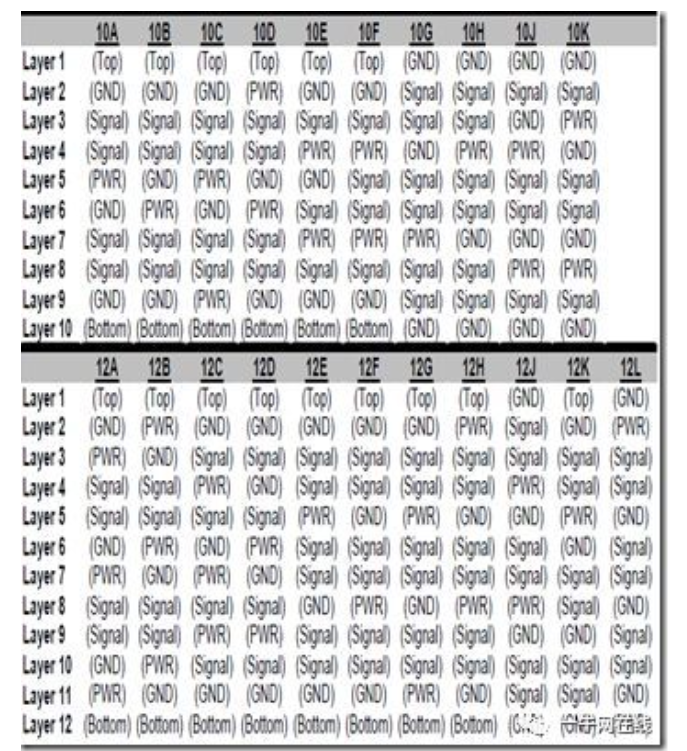 最常用的叠层结构主要是06A,06G,06K。06A有四层布线层,便于布线。06G有两个GND,这样的话Top与Bottom层参考平面都是GND,是一种很好的选择。对于06K,这样做,主要是3个信号层布线有点紧张,让第四层作为备用的信号层,最后不用的地方都铺上铜箔,即确切的说,该种叠层结构的layer4是signal/GND。对于其他的叠层结构,像10层,18层,这里不多介绍,下图以便参考。