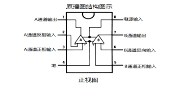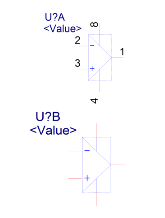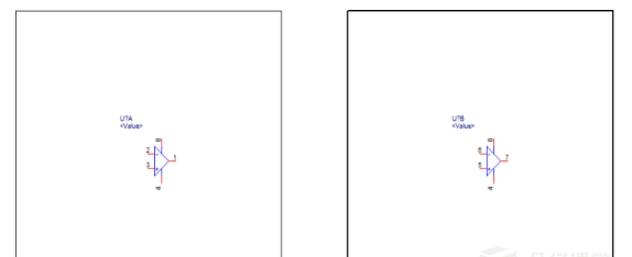 我们以LM358这个IC为例,讲解下Homogeneous类型元器件的创建方法,LM358的原理部分结构如图2-40所示,是由两个完全一样的放大器集成的,
