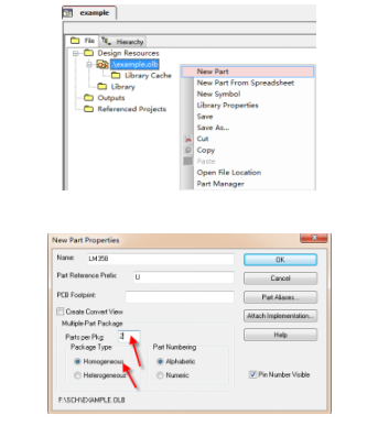 第一步,在olb文件单击鼠标右键,建立新的New Part,Name那一栏输入LM358,PCB封装那一栏可以先不填写,下面的Parts per pkg输入2个,由两部分组成,Package Type选择Homogeneous,其它的按照系统默认即可,点击ok,如图2-41所示,
