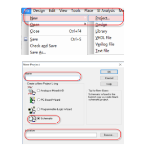第一步,打开orcad软件,执行菜单File→New Project…,如图3-1所示,在弹出的界面中选择输入工程的名称,选择工程的类型是原理图Schematic,Location选择工程文件需要存储的位置;