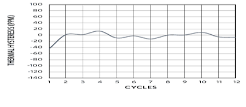 如果器件在其低温额定值和高温额定值之间循环(例如,许多组件的温度范围为-40°C至125°C),则对于典型的带隙基准电压电路,输出的总变化可达到〜1 mV。正确安装在PCB上的高精度电路在整个工作温度范围内的迟滞值可低至〜105 ppm。注意,即使电路的温度保持恒定,在这些电路中也会发生长期漂移。