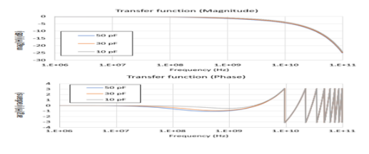 从该图可以看出,随着负载电容的减小,直到更高的频率才会出现低通滚降。仅通过使用具有较小负载电容的组件,我们就能获得几个额外的GHz余量。在中频处(低于第一个相位反转),由于相位曲线在约10 GHz以下更平坦,因此失真较小。两条曲线都应说明在信号带宽中阻抗匹配高达高频的难度。在这里,我们甚至没有在这些计算中包括铜的粗糙度,纤维编织效应或集肤效应。